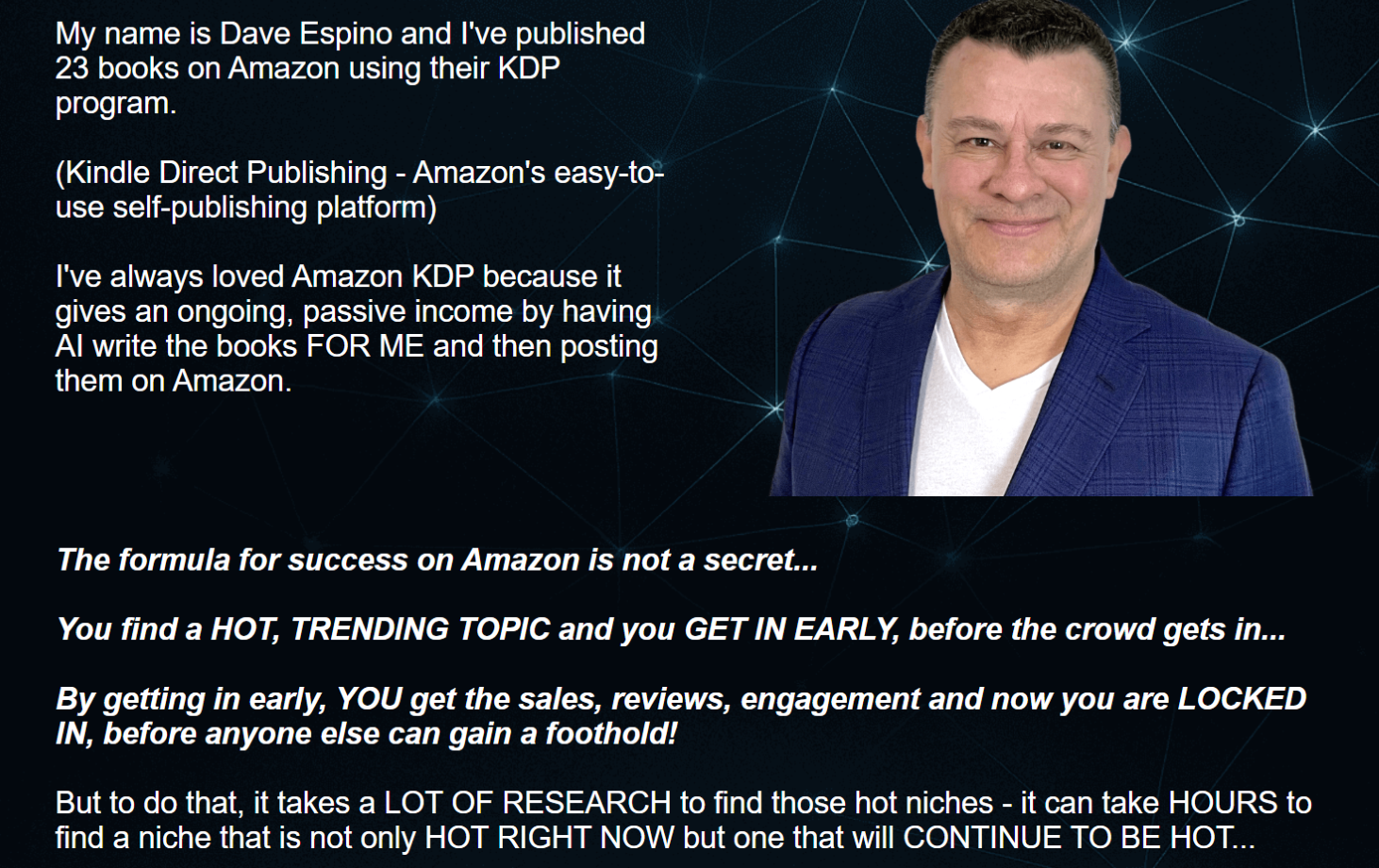 Dave Espino is an experienced Amazon KDP publisher with more than 23 published books and years of hands-on experience helping creators generate passive income through digital products. His deep understanding of niche research, trend identification, and real-world publishing challenges directly shaped the vision behind TrendHunter AI—specifically, the need for a faster and more reliable way to identify profitable book opportunities before markets become saturated.