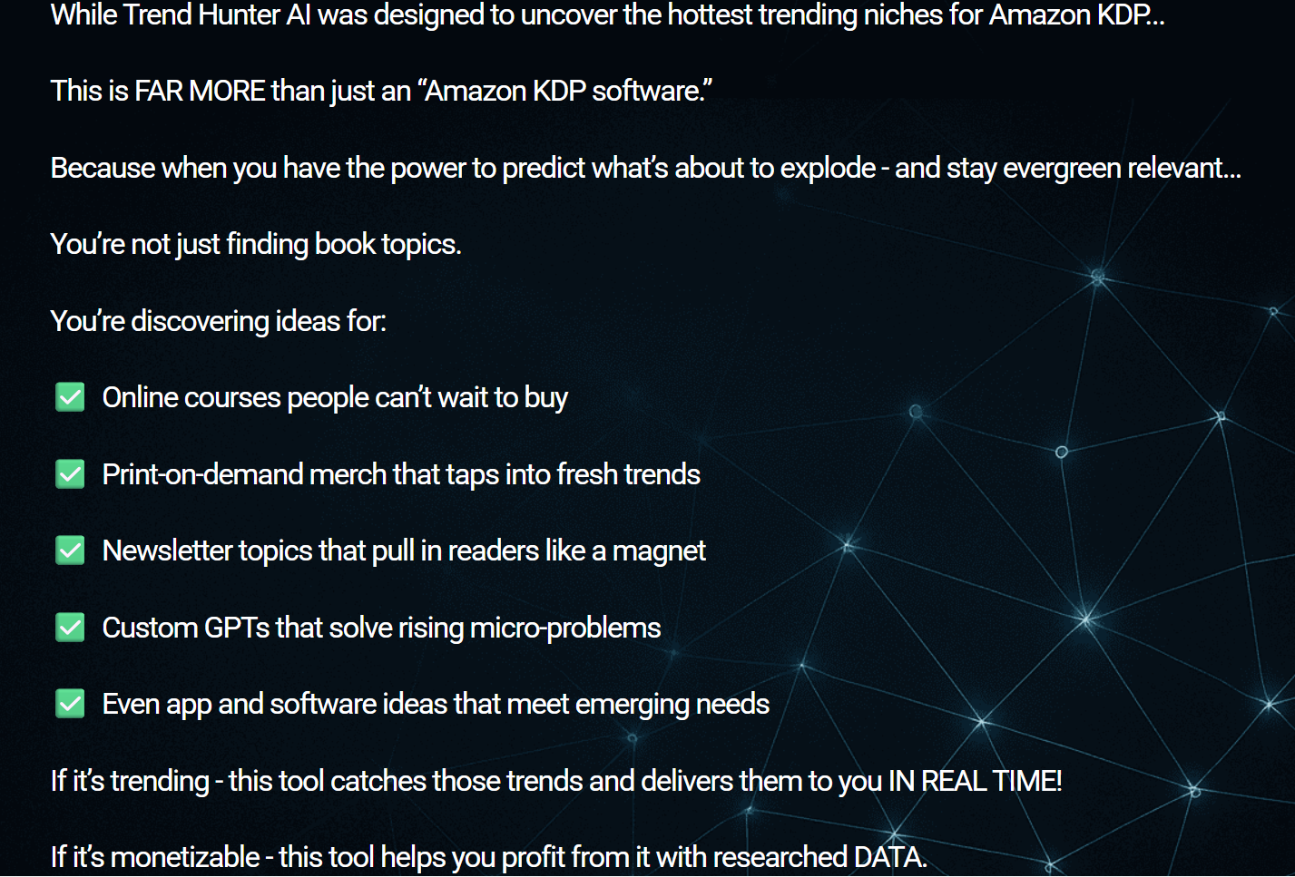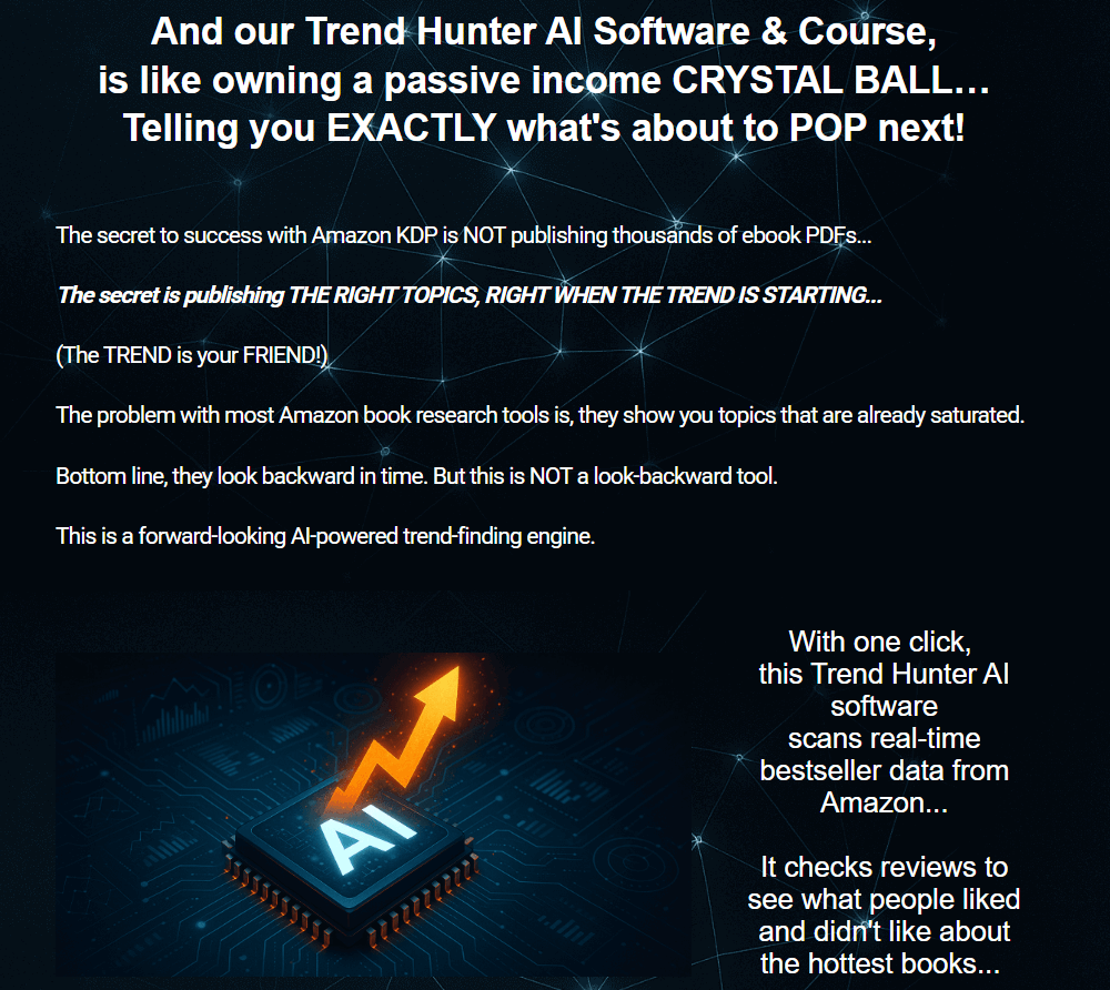 In summary, TrendHunter AI is a powerful real-time trend research platform designed to help Amazon KDP authors and digital product creators identify high-demand, low-competition niches with significantly less guesswork. By combining live Amazon market data, cross-platform trend validation, intelligent scoring, and visual indicators—alongside comprehensive KDP and AI-focused training—the platform positions itself as a valuable strategic asset for creators aiming to build trend-aligned, sustainable income streams.