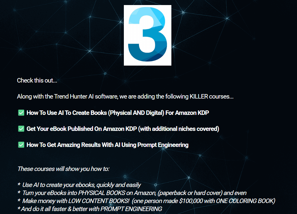 Overall, when you consider the combination of real-time market intelligence, lifetime access, and included training courses, TrendHunter AI offers a strong value proposition—particularly for creators who plan to publish multiple titles or develop several products over the coming years.
