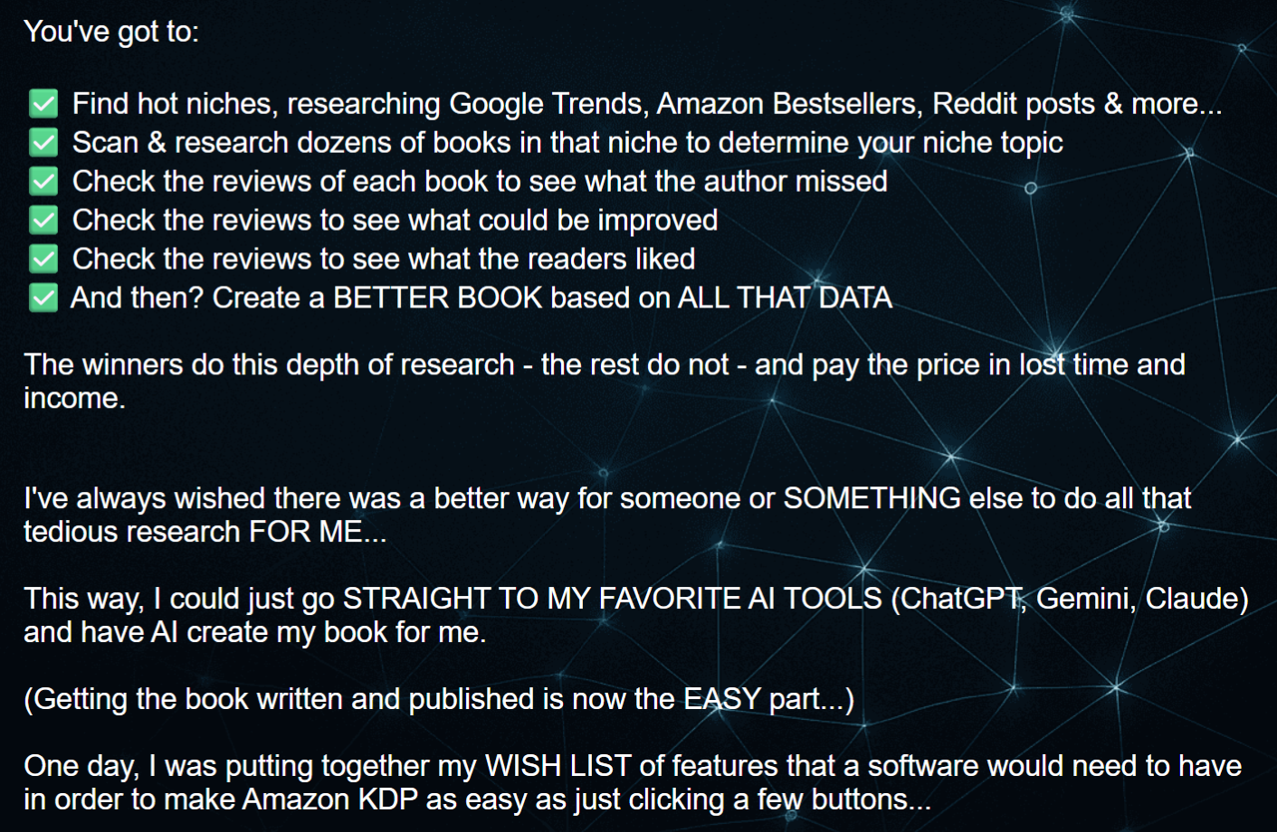Finally, you take these validated niche insights and apply them to your publishing workflow—whether that’s outlining an ebook, audiobook, print book, or feeding the data into your preferred AI writing tools.